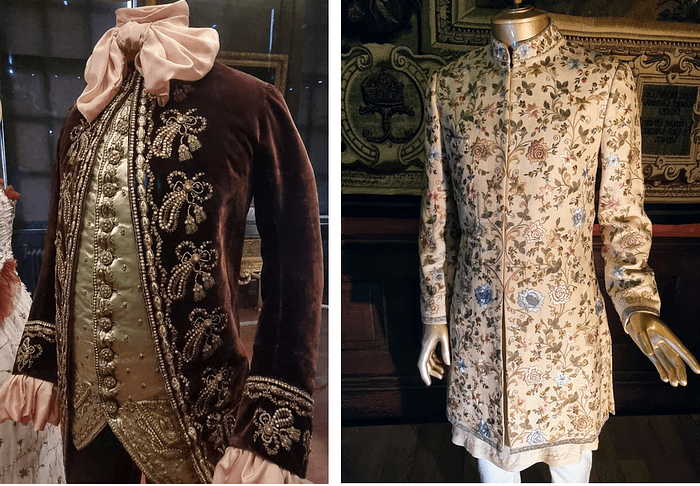 The exhibition beautifully illustrated the parallels at court with an 18th-century embroidered velvet jacket and waistcoat with an outfit worn by Tan France to the Emmy Awards 2019 celebrating his South Asian heritage. He wore a silk kurta (tunic) and an embroidered sherwani coat by Indian designer Varun Bahl.