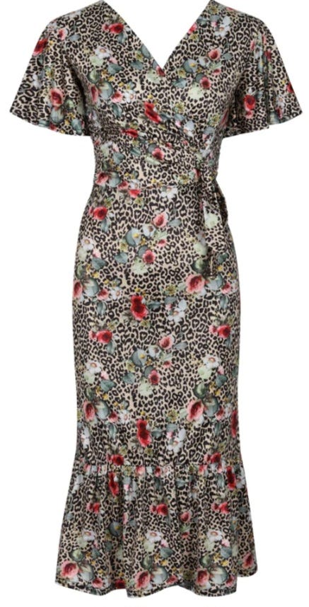 Patern mixing has been seen as a no-no in the past but there is a current vibe of leopard-print background with floral detail. I’ve seen very few examples of this that actually work but this wiggle dress from Pretty Kitty seems to cut it.